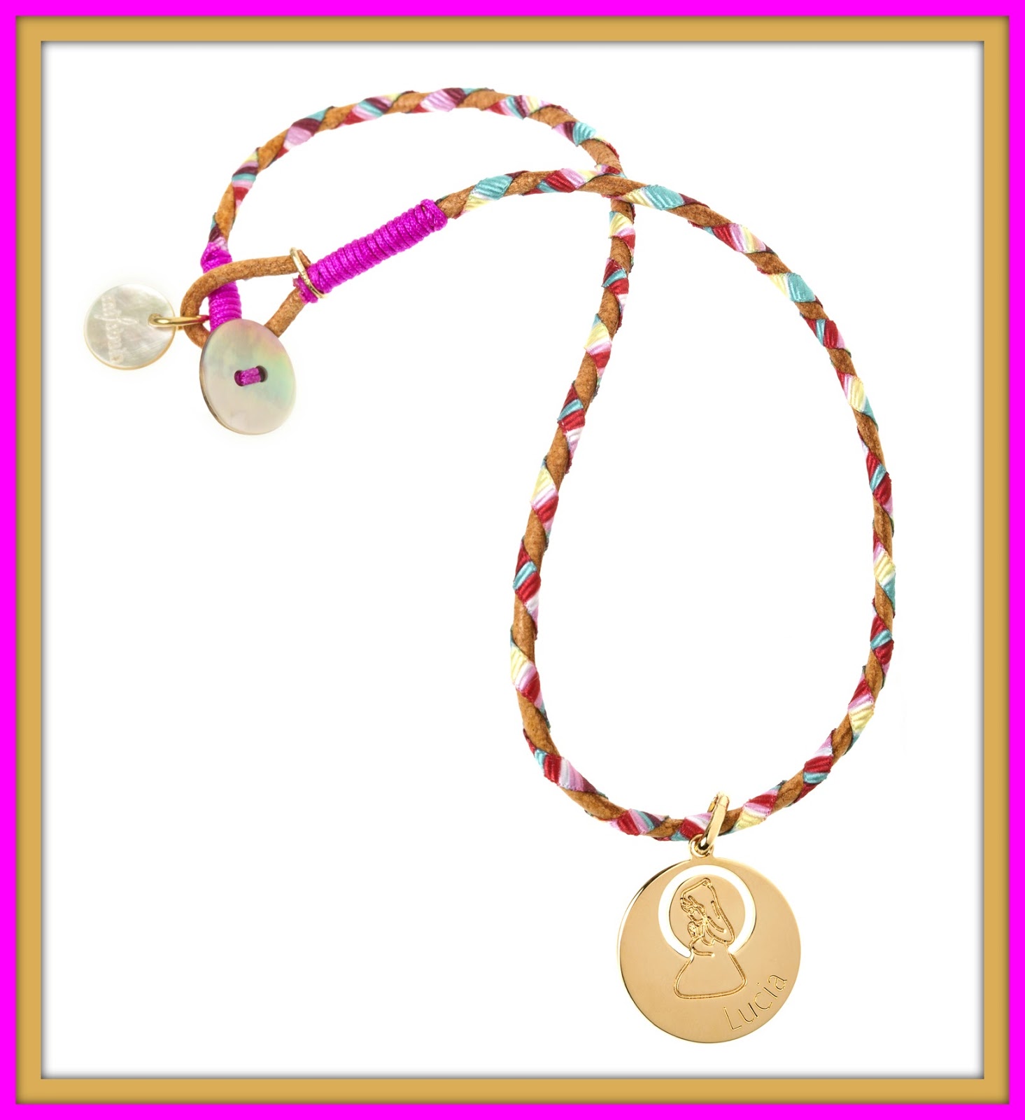 Este colgante me encanta con este cordón tan colorido y puedes combinarla con la pulsera de abajo con ese lacito tan colorido.