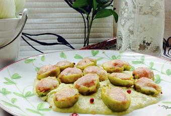 Coles rellenas. Preparamos un plato delicioso con la "Menina" de las coles, de nacionalidad belga, concretamente de Brusellas que las hemos rellenado de pollo y servimos en su propia crema que hemos cocinada pochando el corazón de las coles con una cebollita y una cucharada de crema de queso.