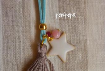 Cordón color ciclamen , estrella verde mar y borla aguamarina...qué bonito!