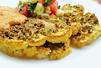 - Cortamos la coliflor en láminas gruesas de 1 cm de ancho. Primero las pasamos por la mezcla de rebozado, dejamos escurrir un poco y pasamos por la mezcla de crujiente de almendras por ambos lados.