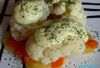 *Con estos ingredientes salió para dos personas, lo tomamos de plato único con un bol de fruta y yogur de postre. INGREDIENTES -dos patatas medianas -una zanahoria -media coliflor, depende del tamaño, esta era grandecita -salsa mayonesa -perejil picado PREPARACIÓN Las verduras las he cocido en la vaporera, pero se pueden cocer en la olla exprés. Esta verdura queda mejor al vapor porque queda muy sequita y las salsas o aliños se integran muy bien. Para cocerlas cortamos los ramos de coliflor sin tallos y los colocamos en la vaporera. Pelamos y cortamos la zanahoria en rodajas finas y las colocamos también. Ahora pelamos y lavamos las patatas. Las cortamos en rodajas que no sean muy gruesas y las colocamos también en la vaporera. Tapamos y lo llevamos al fuego, lo tenemos cociendo unos quince minutos o veinte hasta que esté todo tierno. Entonces apagamos el fuego manteniéndolo tapado hasta el momento de servir. Ahora hacemos una mayonesa de un huevo y la reservamos. Con una rasera sacamos con cuidado la verdura para que no se rompa y la vamos colocando en una fuente amplia.