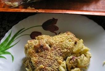 - Escurrimos las patatas y la coliflor con cuidado de que no se nos rompan ninguna de las dos cosas. Y luego las repartimos por una fuente de horno.