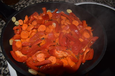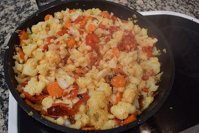 Lo primero que hacemos es cocer la coliflor. Lo hice en el micro. Para ello corta la coliflor en tallitos pequeños, ponla en un recipiente apto para el microondas, añade unos 70 g. de agua. tapa con papel film haciendo un agujerito en él para que salga el vapor o tapa con su tapadera si la tiene. Introduce en el microondas durante 7 minutos, potencia máxima. Deja reposar un para de minutos antes de abrir el recipiente. da unas vueltas y comprueba que están cocidas. Si no es así programa un par de minutos más. Saca, escurre y reserva.En una sartén pon a calentar el aceite. Dora las dientes de ajo laminados, añade el pimineto cortado en tiras. Rehoga un poco e incorpora las zanahorias peladas y cortadas en rodajas.