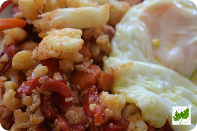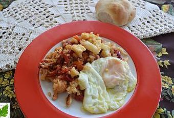 Sirve a compañada de uno o un par de huevos fritos y no os olvidéis: el pan es imprescindible. Yo hice estos bollitos.
