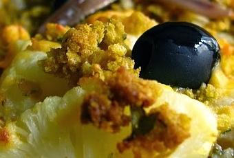 Una coliflor pequeña o media grande4 filetes de anchoa en conserva200 ml de nata para cocinar1 cda de perejil picado200 g de queso cheddar50 g de queso azul (Peñasanta)2 pimientos de piquillo asadosPimienta y sal Dos cdas de aceite de oliva virgen4 ó 5 rebanadas de pan del dia anterior1 cdita de hierbas provenzales Aceitunas negras