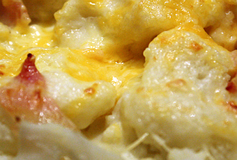 - Derretimos aparte en una sartén la mantequilla, añadimos la harina y la leche. Cocinamos removiendo (para que no se formen grumos) por aproximadamente 15 minutos. Retiramos del fuego. Agregamos el resto del queso, mezclamos y agregamos la yema, mezclamos nuevamente y vertemos sobre la coliflor. Esparcimos por encima el jamon que reservamos.
