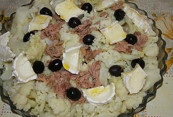 Pon una olla con agua y sal a hervir.Mientras tanto limpia, corta en racimos y lava la coliflor.Cuando veas que el agua empieza a hervir añade la coliflor y tapa. En el momento que comience a hervir, baja el volumen del fuego y deja que se vaya haciendo. Veras que está si al pinchar la coliflor la punta del cuchillo o del palillo la introduces sin esfuerzo. Ha tardado unos 20 minutos.Cuela y escurre bien la coliflor.Corta el queso de cabra en rodajas y parte las por la mitad. Corta el camembert en triángulos. Escurre el atún y las olivas.