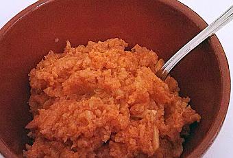 3- Se añaden las coliflores y se fríe todo a fuego lento hasta que se tiñan y se pongan anaranjadas gracias al pimentón. Se pone la sal.