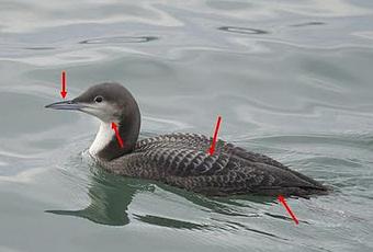 Colimbo del Pacífico (Gavia pacifica) juvenil (Santoña 7/12/09). Características diagnóstica señaladas en rojo