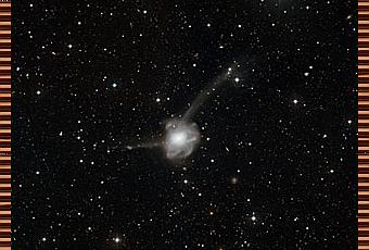 El objeto que está en el centro de la imagen es NGC 7252, es el resultado del choque de dos galaxias. A NGC 7252 también se la conoce con un curioso nombre “Átomos por la paz”, en el portal de la ESO, nos cuentan de donde viene ese nombre tan curioso. Según parece, el Presidente Eisenhower dio una charla en diciembre de 1953, que llevaba por título ese “Átomos por la paz”, el tema de la misma era promover el uso de la energía nuclear con fines pacíficos. La charla tuvo cierta repercusión en la comunidad científica hasta el punto de que a NGC 7252 se la bautizo como la galaxia de Átomos por la paz. La verdad es que el nombre parece ciertamente apropiado ¿acaso no os recuerda la forma de esta galaxia al típico diagrama de un átomo con su núcleo en el centro y los electrones a su alrededor en una nube difusa?