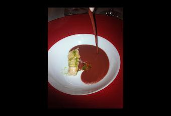 En ninguno de los casos, el aperitivo de la casa no fue digno de recordar. Un Bloody Mary y una brocheta de queso con tomate. Aunque el segundo día no fue mejor, un ajo blanco y una aceituna gigante rellena de espuma de anchoa y coronada por un puré de oliva negra. ¡Pan con pan! Eso sí, servidas en raciones individuales, sobre una cucharita de loza muy a la moda. Tras el aperitivo venían los entrantes. La diferencia era notable aunque en ambos casos no esta muy ajustado el precio a la materia prima empleada. En el primero de los menús nos dieron un delicioso gazpacho de cerezas acompañado por unos mini taquitos de pimientos multicolores y un solitario langostino. A continuación unos nísperos, tres mitades, coronados por una espuma de foie y una gelatina de Amaretto, que lo mismo podía ser entrante que postre. No sabría decir si el tercero de los entrantes fue el que más me gustó, pero lo que si se es que estaba delicioso, y fue un huevo cocido a baja temperatura acompañado de setas y pasta Kataifi. Todos estos entrantes vinieron acompañados de un blanco Albariño, Valtea. Para finalizar una espuma de foie e higos. Como el menú era con maridaje, para este último entrante nos trajeron un vino espumoso dulce italiano, un Moscato llamado Toso. Esto del maridaje es una idea excepcional si se hace bien, pues te permite probar varios vinos y combinarlos con los distintos platos. Pero también requiere la atención continua del camarero para rellenar las copas vacías, cosa que no se hizo en ninguna de las cenas por lo que fue un quiero y no puedo muy beneficioso para la economía de la casa.