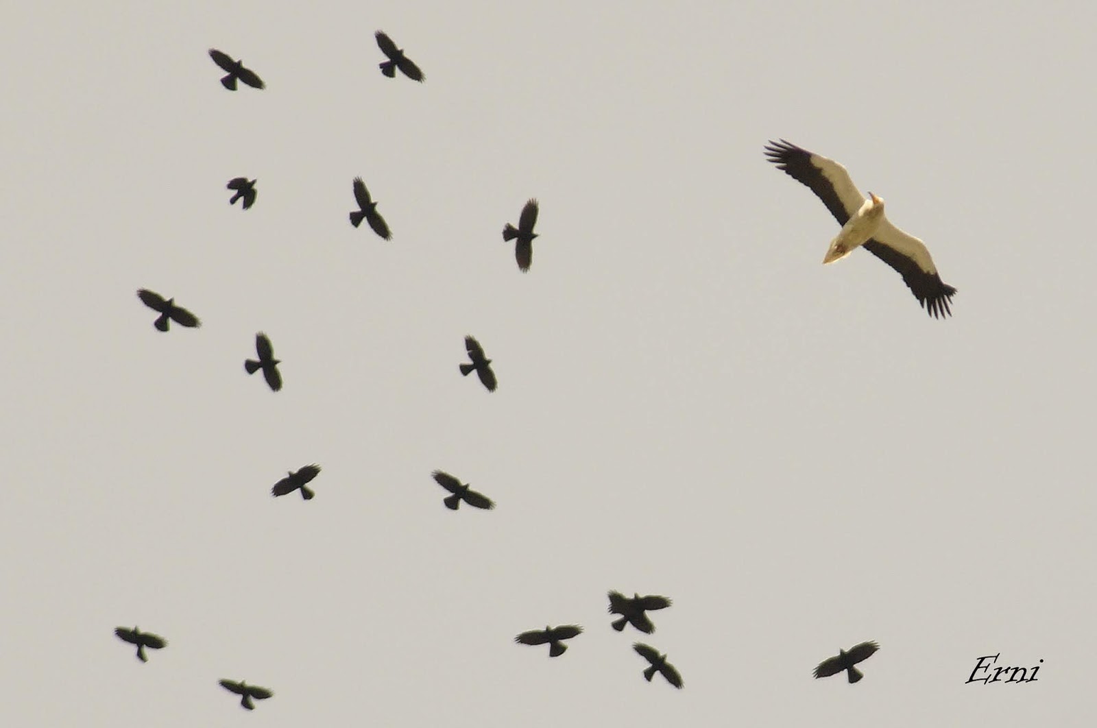 Una pareja de alimoches asentada en la zona acompañada de las escandalosas chovas piquirrojas.