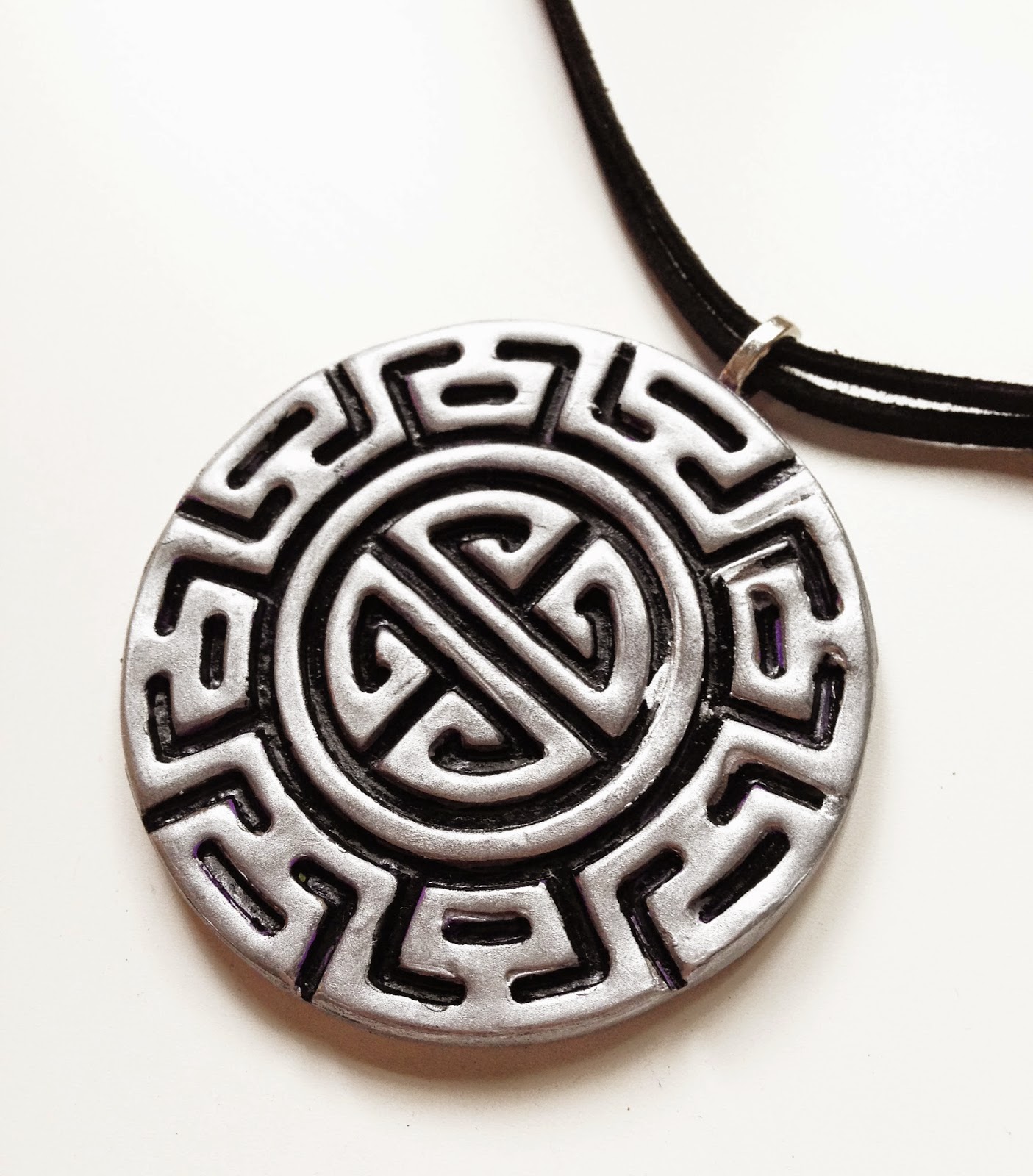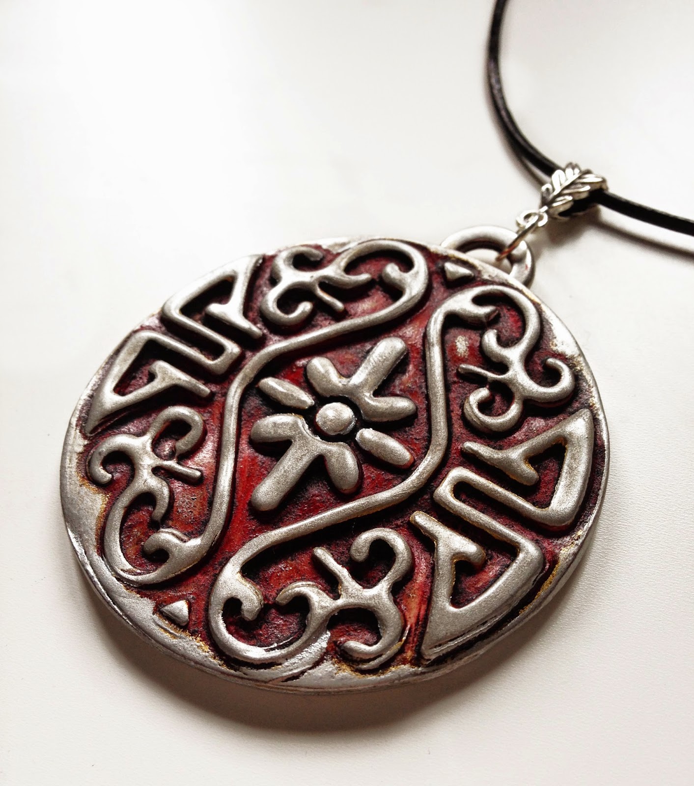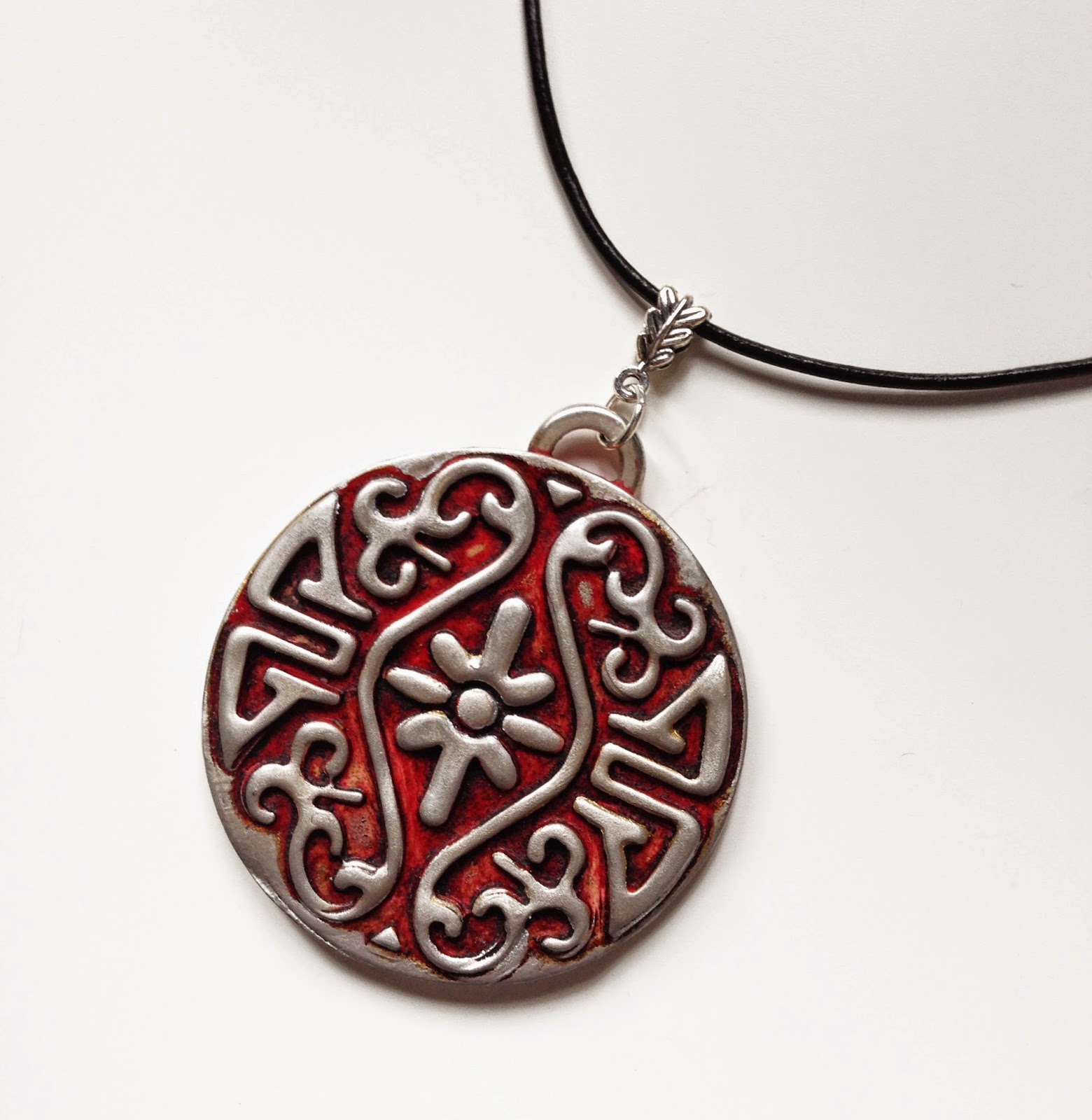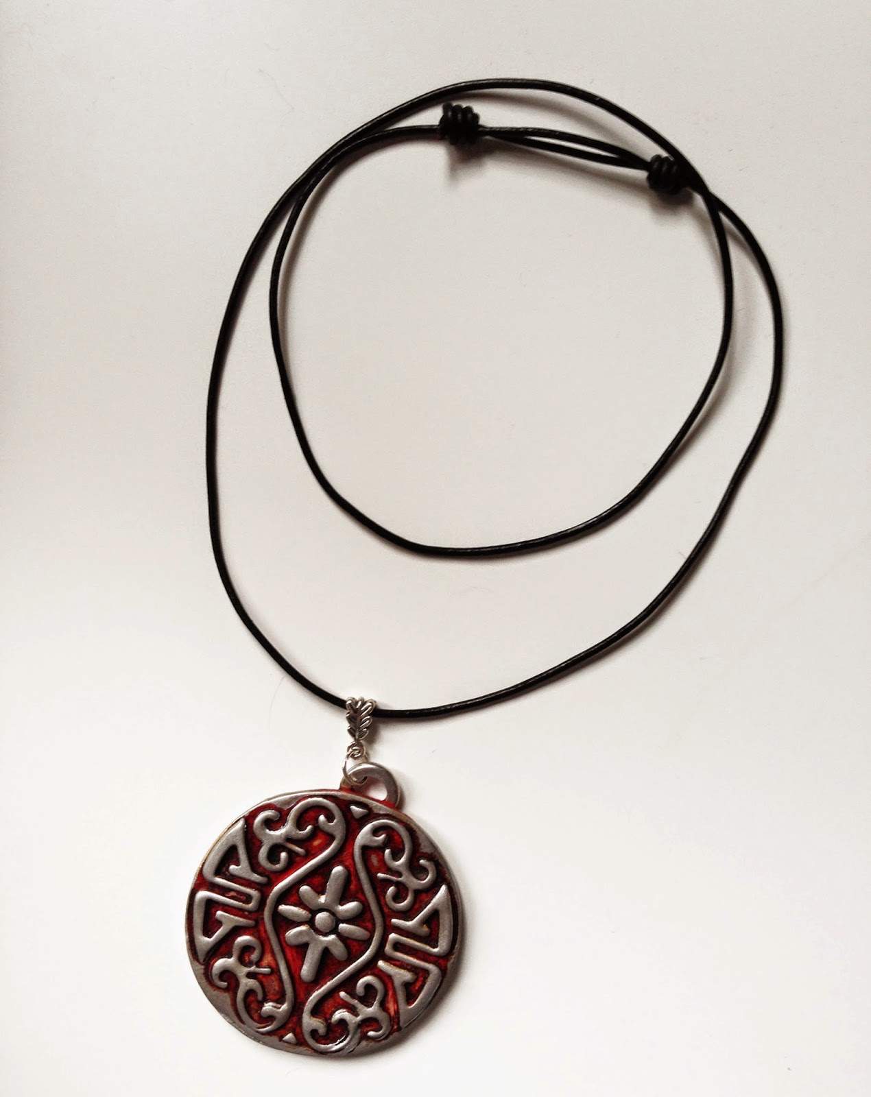 Este es rojo y plata y va montado con cordón de cuero negro y nudo corredizo, así puedes ajustar el largo a como más te guste.