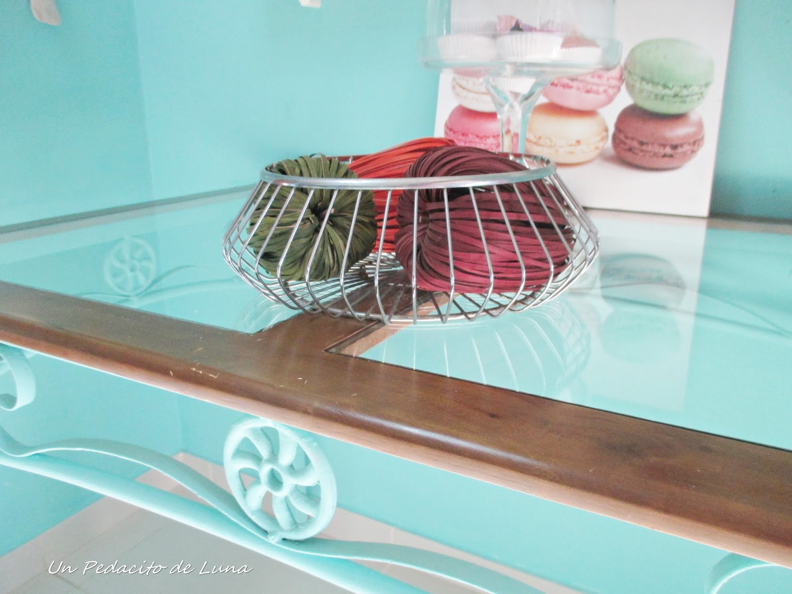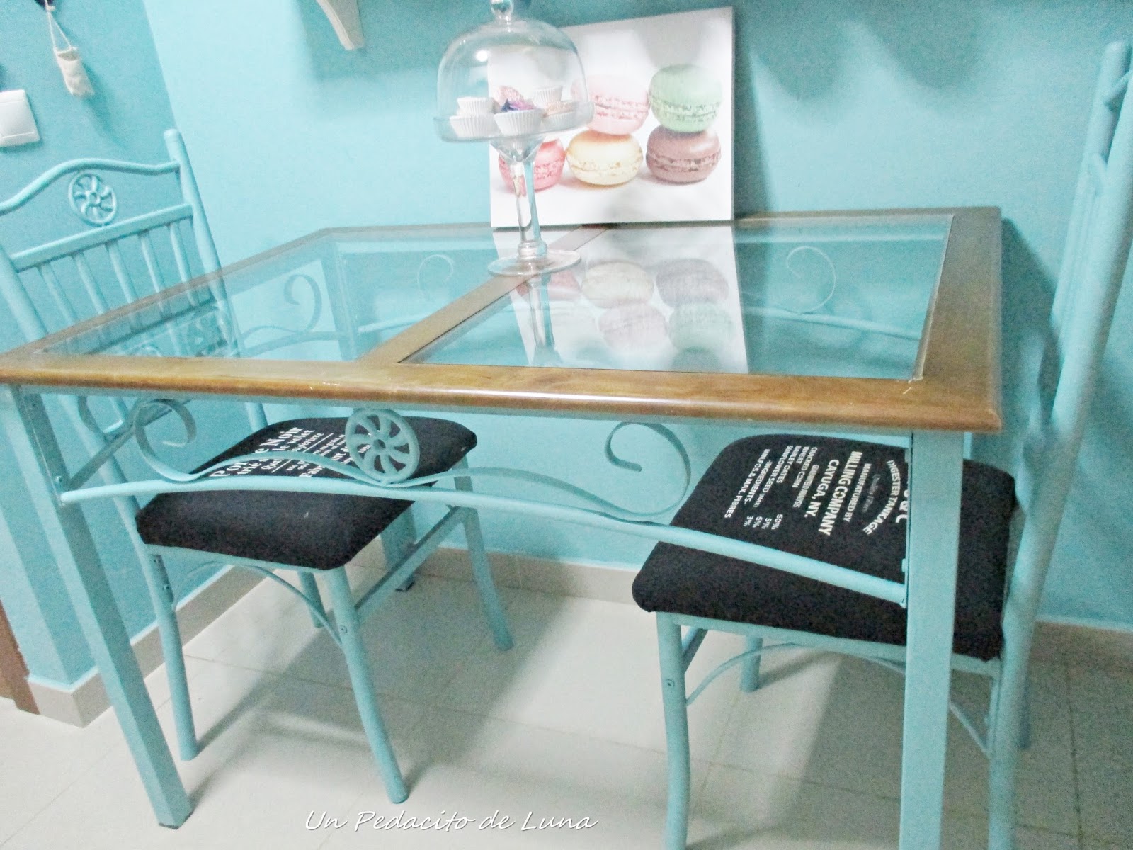 Si bien en principio albergó el espacio cómodamente, es cierto que no terminaba de encajar en la decoración de la cocina. Así que cuando hace algunos meses se animaron a dar color a la pared, un tono agua-turquesa muy alegre, a mi se me ocurrió que podríamos darle otro efecto a la mesa para que, visualmente, no recargase el ambiente.