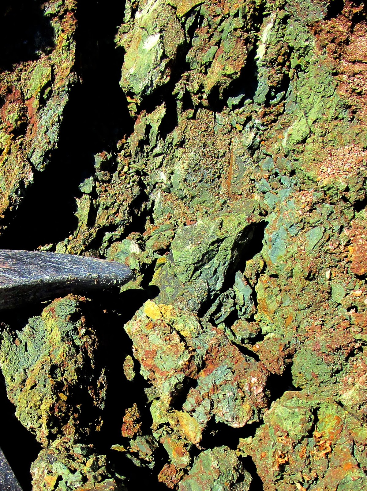 La caliza impregnada de ocre contrasta con las arcillas verdes.