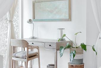 Una mención importante tenemos que dar a los tonos azules y verde pocos saturados y al delicioso rosa palo. Destacan por dar una nota de color, sin estridencias y en conjunto con el resto de la decoración.