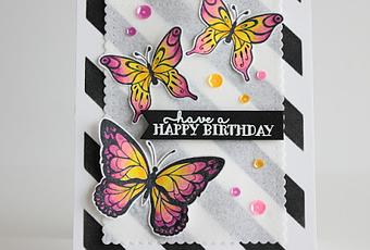 ¡Hola! Hoy quiero enseñaros la tarjeta que he hecho para participar en el reto actual de "Runway Inspired Challenge". ¿No creéis que esta combinación de colores es una preciosidad? He utilizado colores Prismacolor premium para pintar las mariposas y estoy totalmente enamorada. Nunca imaginé que pudiera conseguir una intensidad de color como esta con lápices de colorear.