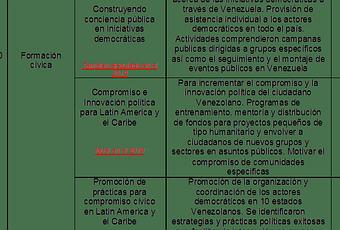 - Este cuarto programa (Por más de 50 mil dólares) era para la promoción de la organización y coordinación de los actores democráticos en 10 estados Venezolanos. Se pretendió identificar estrategias y prácticas políticas para facilitar la interacción de individuos y grupos en estos 10 estados