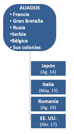 El núcleo de los Aliados lo constituyó la Triple Entente: Francia, Gran Bretaña y Rusia. Unidos por tres tratados lo suficientemente flexibles para poder resistir los avatares diplomáticos y funcionar durante buena parte de la contienda.