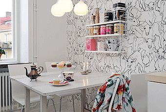Vemos que ya en la cocina, para darle mucha fuerza a la zona de comedor, colocaron un arriesgado papel pintado de vacas, que le da mucho movimiento. Se le da protagonismo donde a diario el espacio suele estar reducido, porque fijaros que la mesa es plegable y se queda en escasos 30-40 cm. de fondo. Servicio para no perder funcionalidad.