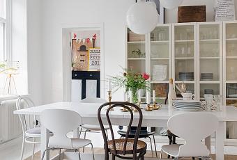 Pintado totalmente en blanco sobre una alfombra de fibras y color natural el comedor se compone de 6 sillas desparejadas, 2 sillas blancas Ant u ‘Hormiga’ y una silla negra de la Serie 7, ambos tipos diseñadas por Arne Jacosen para Fritz Hansen y otras 3 sillas tipo Thonet, una en blanco y 2 en marrón oscuro. La mesa robusta es de Ikea (parece el modelo Norden en blanco) y las 3 vitrinas también son de Ikea, el modelo Billy. La lámpara retro de bolas blancas y los adornos sobre las vitrinas como las modernas bolsas de papel Le sac en papier completan el comedor. Ah! muy importante, daos cuenta como el contenido de la vitrina se mantiene en los mismos tonos, blancos y maderas, con algún detalle pastel para que no robe protagonismo. El resto del piso tampoco tiene desperdicio ¿Qué tal, os gusta? Es fácil de imitar ¿no?