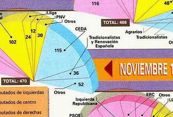 1. CLASIFICACIÓN.La imagen incluye tres gráficos semicirculares que representan la forma del hemiciclo del Congreso. Se replica la distribución de los escaños agrupados por ideologías (izquierda, centro y derecha) obtenidos en las tres elecciones generales celebradas durante la II República Española, proclamada el 14/04/1931 en las elecciones municipales celebradas tras la dictadura de Primo de Rivera.2. ANÁLISIS-DESCRIPCIÓN.En cada uno de los gráficos se muestran tres sectores de color rosa (izquierda), amarillo (centro) y azul (derecha). A su vez, los subsectores indican el número de diputados de cada partido en el arco parlamentario.3. COMENTARIO.- En las elecciones generales convocadas en junio del 1931 por el gobierno provisional de la República, vence la izquierda (PSOE, Acción Republicana y Esquerra), confirmándose tanto el presidente de la República (Alcalá Zamora) como el del gobierno (Azaña). Se elabora la constitución progresista del 1931 que otorga amplios derechos y libertades a los españoles y comienzan importantes reformas (educativa, militar, religiosa, laboral, agraria y regional). Los militares intentan un golpe de Estado (Sanjurjada) en 1932. El gobierno dimite en 1933 por los sucesos de Casas Viejas.- En noviembre de 1933 vence la coalición de centro-derecha del partido radical (Lerroux nuevo presidente) y la CEDA (Gil Robles). Se paralizan casi todas las reformas, lo que provoca la revolución obrera de 1934 que triunfa en Asturias (duramente sofocada por Franco); e independentista en Cataluña (se suspende su autonomía). El escándalo del estraperlo salpica a Lerroux que dimite.- En 1936 vence con un margen escaso una nueva coalición de izquierdas (Frente Popular). Azaña sustituye a Alcalá Zamora en la jefatura del Estado, mientras que el presidente del gobierno es Casares Quiroga, que intentará continuar con las reformas en un ambiente de violencia creciente. Tras los asesinatos del teniente Castillo y de Calvo Sotelo se produce la sublevación de una parte del ejército (18/07/1936) que lleva a la Guerra Civil (1936-1939).