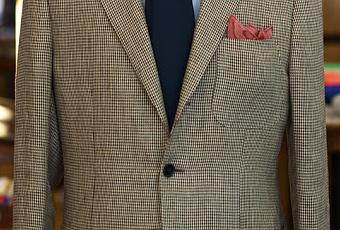 La combinación cromática me parece preciosa y, como veremos en el detalle a continuación, la chaqueta está confeccionada con un bonito tejido de pata de gallo que combina el camel con el marrón de forma muy acertada.