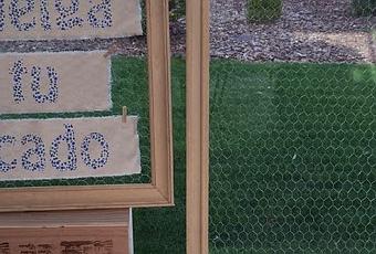 Hicimos bastidores con unos bonitos marcos de madera que decoramos con malla de gallinero para que cada invitada colgara su tocado. Además hicimos un letrero con tela de piqué de flores azules, como el color de los zapatos de la novia.