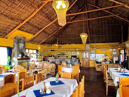 Bambú Hotel y Restaurante. Cercano a Santiago de Atitlán. Durante nuestro recorrido por los pueblos del lago, al llegar a la ciudad de Santiago, atracamos la embarcación en el Restaurante hotel Bambú, que tiene un muelle de acceso para las lanchas. Tiene buena construcción típica y una cuidada decoración en el salón comedor. Comimos muy bien, un pescado llamado dorado preparado al ajo. De entrada, los infaltables nachos con salsa de frijoles. Tienen artesanías y hermosos dibujos de artistas locales para la venta.