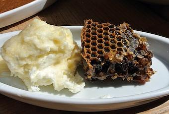 {Kaymak (como la nata cuajada o clotted cream inglesa) y miel en panal}