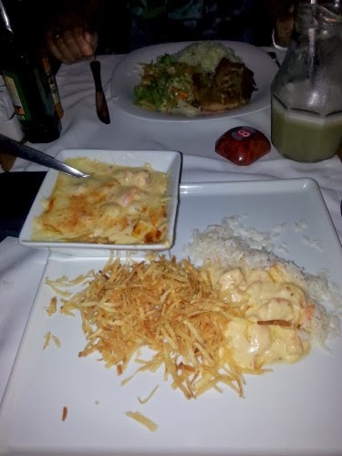 Imperador dos camaroes. Pedimos Chiclete de camarones que puede ser para una o dos personas. Es un plato de camarones con una salsa de cinco quesos que forman como un chicle, de allí el nombre que no suena muy elegante pero es sabroso. Por lo que leímos en la carta es un plato registrado por el chef. Lo acompañan con batata palha. Sirven muy rápido.