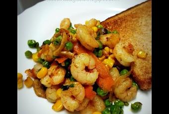 Este plato lo preparé asi: Sofreí en 2 cucharadas de aceite de oliva, media cebolla picada, un ajo, un puñado de guisantes, un puñado de maiz dulce, una zanahoria la cual corté en lajas con un pelador de papas. Aparte corta un ajo en pedacitos y con 1 cucharadita de aceite de oliva sofrielo, y agrega los camaroncitos o pollo o lo que tengas a mano. En este caso los camarones, les agregue sal y pimienta y un poquito de perejil picado para darle mas sabor.. al final un chorrito de limón y luego mezcle todo. Aqui puedes ver >>> más recetas saludables Pueden acompañarlo con 1/2 taza de arroz o pasta integral o una tostada. No se preocupen por el consumo del aceite de oliva mas que pensar que puede engordarnos, nos hace bien, es grasa monoinsaturada que nos baja el colesterol malo, es antioxidante (previene la muerte celular y por ende retrasa el envejecimiento) y ademas favorece la absorcion del calcio, y asi innumerables beneficios mas para nuestra salud.