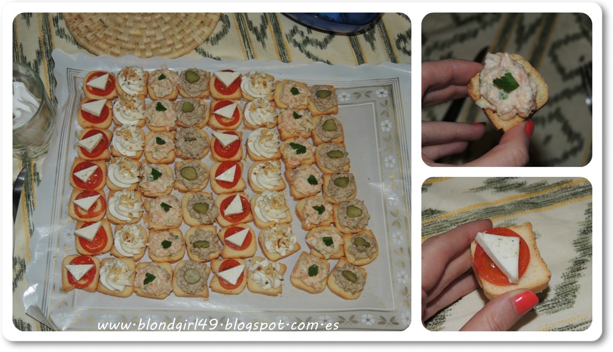 Normalmente cada año era mi abuela la que se encargaba de la comida, pero ha llegado un momento que se le hace muy pesado cocinar para tantas personas así que a partir de ahora ha decidido que encargará la comida... estuvo bastante buena aunque me gusta más como cocina mi abu xDDDe picoteo había varias bandejas como esta de canapés (minibiscotes), mis preferidos fueron los que salen a la derecha, el de cangrejo y el de tomatito cherry con quesito. Los otros eran de patés raros y uno de roquefort, normalmente me gustan pero así me supieron algo raro :S