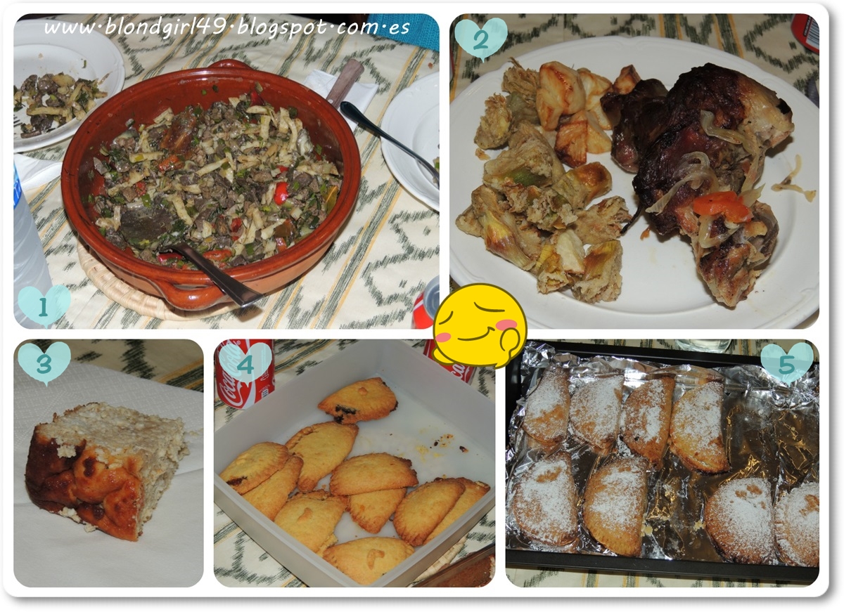 1. También antes de repartir el plato principal sacaron unas cuantas greixoneres de frit mallorquí (frito mallorquín) que puede variar en sus ingredientes pero el típico lleva patata, hígado, cebolla, pimiento rojo y verde, y también varios condimentos pero destacan el hinojo y el laurel. A mi como no me gusta el hígado no suelo ponerme pero sí intento coger patata y las verduritas xDDD, para la próxima vez lo pedirán con alguna carne en vez del hígado :D2. Para el plato principal se podía elegir entre lechona o cordero, yo me cogí cordero que me sienta mejor al estómago :), llevaba zanahorias y cebolla (que luego me puse más cuando pasaron la bandeja) y de acompañamiento cantonets de patata con alcachofa(L)3. Mi abuela hizo brossat que también es muy mallorquín, es algo así como un bizcocho de requesón con azúcar que queda húmedo una vez horneado. ¡Es riquísimo! Alguna vez he preparado pero nunca os he puesto la receta.4. Mi abu también preparó robiols rellenos de cabello de ángel + confitura de albaricoque y otros de chocolate (que fueron los que volaron primero xD)5. Yo traje también robiols, los míos eran de confitura de albaricoque y de brossat^^. Si queréis ver la receta os dejo aquí el enlace.Como veis todo muy mallorquín xDDD