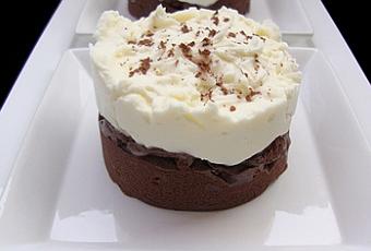 Para la crema de quesos, batiremos ambos quesos con el azúcar glass; de manera que obtengamos una crema densa. Llenaremos los moldes de acetato, un poco menos de la mitad, con la cama de chocolate y encima colocaremos la crema de quesos. Dejaremos enfriar en la nevera al menos 4 horas antes de su consumo. Serviremos retirando el acetato y espolvoreando un poco de cacao puro en polvo.