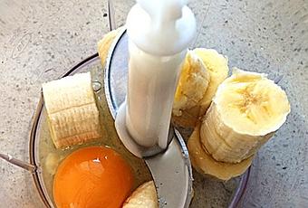 2. Agregue el plátano y el huevo en rodajas gruesas a un procesador de alimentos o licuadora manual. Blitz hasta que quede suave.