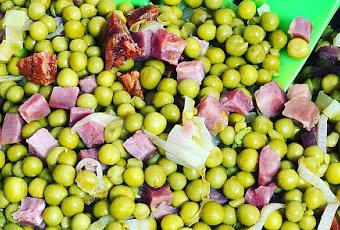 En primer lugar tenemos unos Guisantes !!! como a Alejandra el jamón serrano no le va mucho (en tacos, porque cuando su parte lo corta del jamonero ya es otra cosa) pues decidí echar también chorizo picante, y la verdad es que estaban bien buenos.. no sé porque no los hago más a menudo la verdad..