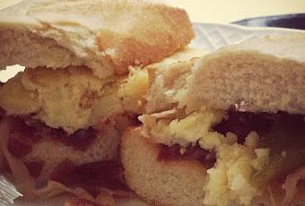 Bocadillo Marimar: tortilla de patatas, pimiento verde, tomate y jamón serrano.