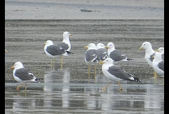 La gran mayoría de las gaviotas presentan ya su plumaje nupcial, en el que se puede observar toda una gama de variedades del negro en el dorso, desde el pizarroso de la subs. graellsii hasta el más oscuro. Un ejemplo claro está en la siguiente foto, el ejemplar que está en primer plano acicalándose presenta un negro muy marcado y más oscuro que el resto. Se trata de la típica gaviota intermedius/fuscus, la discusión entre los adultos de fuscus y los casos extremos de intermedius ocupa ya páginas y páginas.