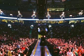 — atu2 (@atu2) Mayo 15, 2015La banda irlandesa ha ofrecido una actuación de 24 canciones en un escenario que ocupa toda la zona de pista, con un escenario en un fondo y otro más pequeño en el extremo opuesto. Entre ambos, una larga pasarela con una gran pantalla que es el eje del espectáculo, pues los músicos pasean tanto por debajo como incluso literalmente dentro de ella, creando un show ciertamente original e interesante.