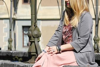 Estos días estamos teniendo un tiempo fantástico, algo casi anecdótico, y no puedo estar más contenta. Además desde el cambio de hora los días por fin son más largos (porque si, a mi los días me parecen más largos cuanto más tarde anochece). Ayer fue día de medio-trabajar, medio-disfrutar así que para la tarde me puse mi querida falda larga y la combiné con un crop-top de las mismas tonalidades, mis nuevas sandalias negras con detalles de piedras (y unos tacones en degradado) y mi americana gris. ¡Espero que os guste!