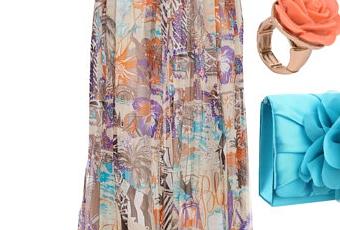 La propuesta de hoy tiene un toque hippie pero muy chic, me parece una propuesta estupenda para una boda de tarde tanto para primavera como verano, un maxivestido estampado en tonos muy alegres, como complementos más color, la cartera azul le da mucha luz y las sandalias doradas le dan un toque al conjunto muy elegante. Joyas sencillas y para el pelo una diadema con flores en tonos suaves.