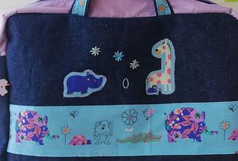 La mamá de Vera me pidió un maletín para transportar los materiales escolares de su pequeña. Lo habitual en el centro es usar uno de plástico, pero ella lo prefiere de tela, así que me pasó medidas y características, a partir de las cuales he hecho este maletin de tela vaquera combinada con una muy alegre en tonos fríos, los favoritos de Vera y su mamá.