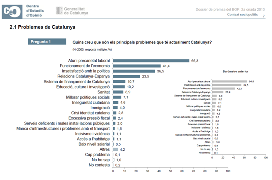 Los datos facilitados por el CEO, la Generalitat, sobre la percepción que tenían los catalanes sobre cuáles eran sus principales problemas no dejan lugar a dudas, el paro, la precariedad laboral, el funcionamiento de la economía, y un alto grado de insatisfacción con la política manifestado en repetidos estudios… por debajo figura las relaciones Catalunya-Espanya, aspecto que no necesariamente indica en la totalidad de su grupo de opinantes una preferencia por la secesión. Salvando las distancias con el pasado fascista, el caldo de cultivo en Cataluña, España, Europa, en esta crisis económica y política, era el más fácilmente comparable al pasado de entre los últimos cien años, propicio para el ascenso de populismos, nacionalismos, y xenofobia, en el que volver la mirada al pasado buscando salidas en antiguas glorias nacionales que enfrentar a los enemigos externos causantes de las penurias actuales. Los independentistas de toda la vida y los sobrevenidos del catalanismo tradicional aprovecharon la oportunidad para redirigir la indignación hacia sueños míticos como la autodeterminación, buscando salidas fuera de los movimientos sociales existentes, así El secesionismo barre los movimientos socialesy el movimiento por la independencia da un salto perdiendo lo concreto de las reivindicaciones para abrazar la mística nacionalista, los independentistas tomaron la fuerza de la indignación para arrojarla contra un enemigo externo, lo español, al que se culpa de todos los males que sufren en la actualidad o hayan padecido en el pasado, reconvirtiendo las luchas hacia la solución de todo para todos, en la independencia.
