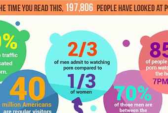 (Traducción: Estadísticas del Porno / Para cuando hayas leído esto, 197.806 personas habrán visto porno / 30% del tráfico web está dedicado al porno. / 40 millones de americanos son usuarios habituales de páginas porno. / 2/3 hombres admite ver porno comparado con 1/3 de mujeres. / 70% de estos hombres tienen entre 18 y 24 años. / 85% de la gente que ve porno lo hace entre las 19hs y las 3hs.)
