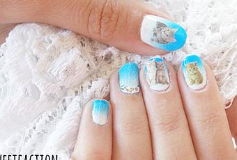 Existen gran variedad de diseños en forma de water decals que permiten decorar nuestras uñas de forma muy original y fácil. Por ejemplo, estos de gatitos disponibles en la Tienda de Nailistas. Mi hermana es una amante de los animalitos igual que yo y cuando vio estos gatos para uñas me pidió una manicura tal que esta.