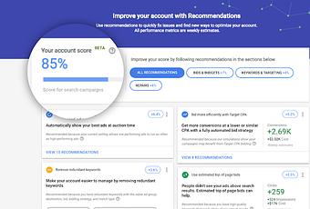 El puntaje va del 0 al 100%, si tienes 100% significa que la cuenta está en el estado óptimo en el que puede rendir al máximo y obtener los mejores resultados. En la medida en la que estas recomendaciones sugeridas por Google se implementen, el puntaje de la cuenta también mejorará.