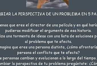 Pero este cambio de perspectiva no siempre resulta sencillo cuando la persona está encerrada en sus preocupaciones puesto que dichas preocupaciones aportan una gran carga de energía negativa. Puedes realizar el ejercicio de cambiar la perspectiva como si se tratase de un juego. ¿Cómo propiciar este cambio de perspectiva de una forma lúdica?