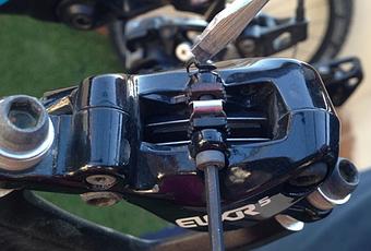 Hay marcas de frenos, como Avid o Hope que tienen una anilla de seguridad que evita que el pasador se salga de su posición. Si nuestros frenos la tienen será lo primero que tengamos que quitar, con ayuda de un alicate.