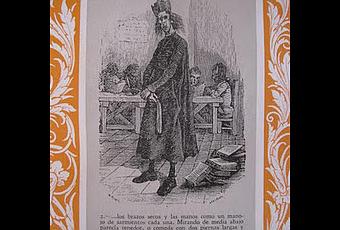La descripción del Dóminie Cabra resulta descarnada:"êl era un clérigo cerbatana, largo sólo en el talle, una cabeza pequeña, los ojos avecindados en el cogote, que parecía que miraba por cuévanos, tan hundidos y escuros, que era buen sitio el suyo para tiendas de mercaderes;